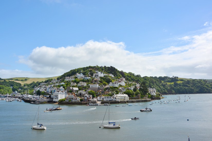 Od rezervace Berry Head pokračujeme k hradu Dartmouth Castle. Jelikož hrad leží na druhé straně zátoky a ta se nám objíždět nechce, rozhodujeme se pro přívoz (ferry) mezi obcemi Kingswear a Dartmouth. Máme tak další zajímavý zážitek a po vylodění na druhém břehu se nám na obec Kingswear naskytne krásný pohled.