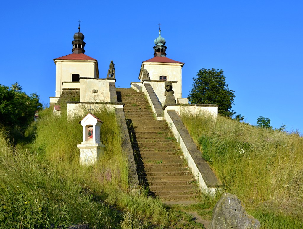 První den máme na programu dvě zastávky – zámek Ploskovice ležící kousek od Litoměřic a vrch Kalvárie nad naším penzionem v obci Ostré (dnes se jedná o katastrální území města Úštěk). Ploskovice, v době naší návštěvy pod lešením, je barokní zámek obklopený rozlehlým parkem. V parku se nachází několik vodních prvků, sochy a bohatá zeleň. Ve stínu stromů si vychutnáváme nanuk z obchůdku na návsi a po procházce parkem se vracíme na penzion. Ještě tentýž den vedou naše kroky na vrch Kalvárie. Jedná se o poutní místo, k němuž kráčíme po křížové cestě. Vrcholu dominují tři barokní stavby – kaple Povýšení svatého Kříže, kaple Nalezení svatého Kříže a kaple Božího hrobu. Místo má zajímavou atmosféru a naskytne se nám odtud nádherný výhled do širokého okolí.