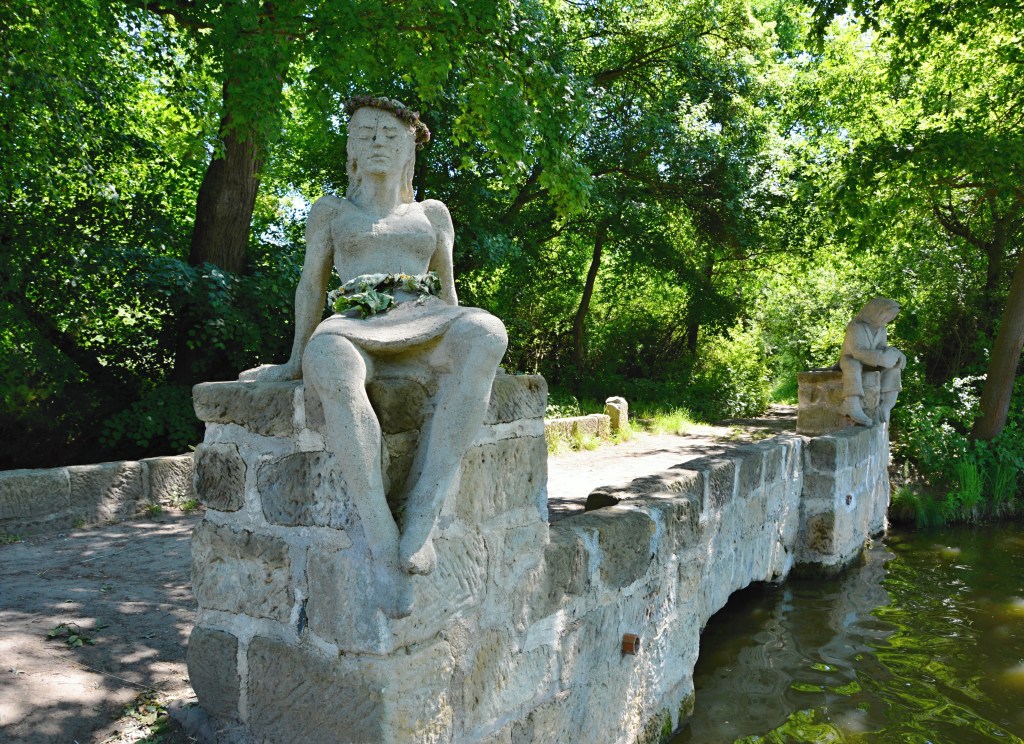 Vítají nás dvě sochy hovící si na kamenném mostě – panna a hastrman. Při pohledu na rybník nelze přehlédnout kupolovitý kopec Vlhošť, který je nejvyšším vrcholem Polomených hor. Na jeho území se nachází přírodní rezervace nesoucí stejný název. Loučíme se s pannou a hastrmanem a po cestě, která nás sem dovedla, se vrácíme zpátky na parkoviště v Holanech (trasa má necelých 7 kilometrů). Navečer ještě z penzionu podnikneme procházku na zříceninu Helfenburk. Pětikilometrový okruh sice nakonec zvládneme i s kočárkem, ale pokud se sem chystáte, tak raději bez kočárku. Po dosažení cíle můžete vystoupat do hradní věže a vychutnat si výhled do okolí.