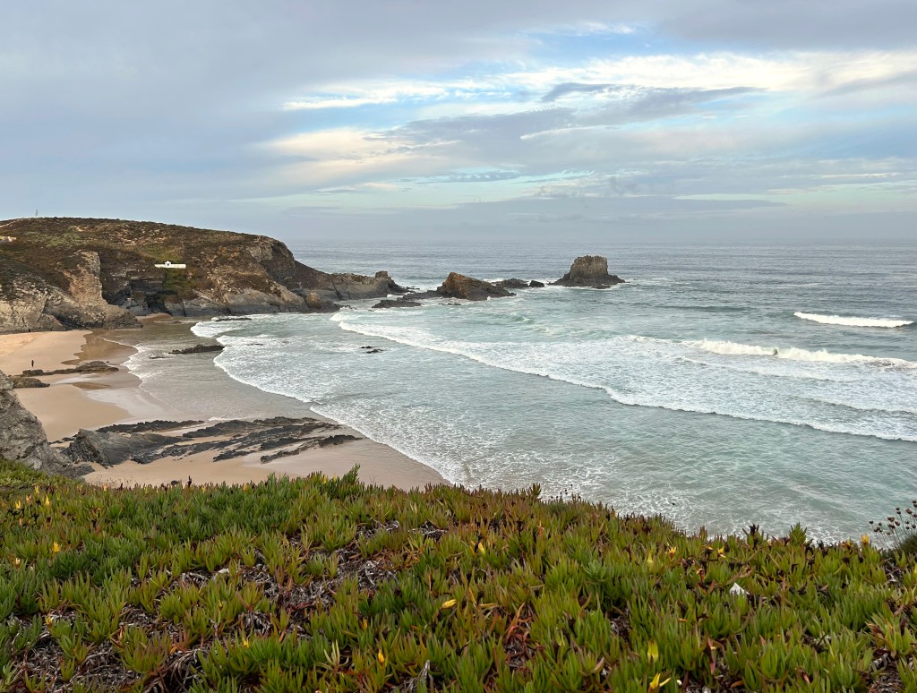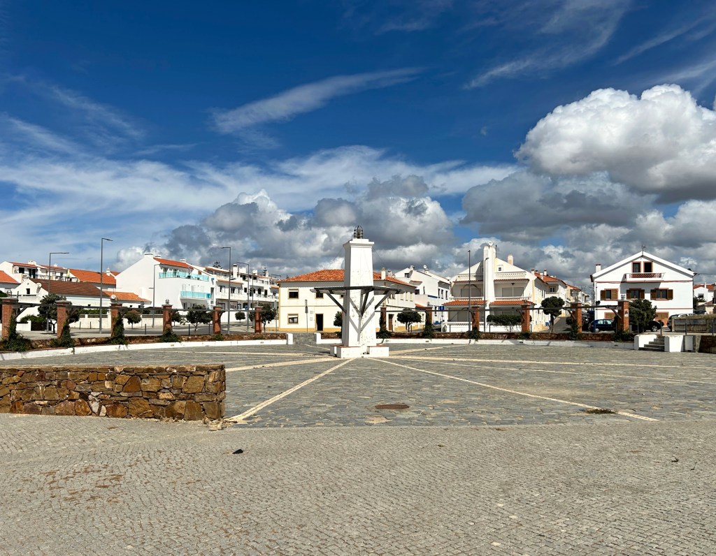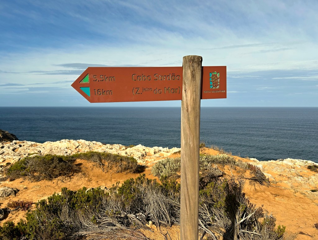 4. září 2023: Dnešní den tolik kilometrů v plánu nemáme, “pouze” 22. Jde se ovšem hezky, obloha svítí a oproti včerejšku se nemusíme bát deště. Hned za Almograve krátký okamžik pozorujeme vlny. To, jak se převalují jedna přes druhou, nás nepřestává bavit. Pokračujeme podél pobřeží na jih. Procházíme pěkným jehličnatým lesem. Je to příjemná změna. Děláme si krátkou zastávku na svačinu a odpočinek v obci Cavaleiro a potom obdivujeme nedaleký maják Farol do Cabo Sandão. Následuje cyklostezka, za kterou jsme vděčné. Sice jsme se odklonily od moře, ale aspoň je oproti včerejšku písku pomálu a tak dnes kráčíme převážně po pěkné zpevněné cestě.