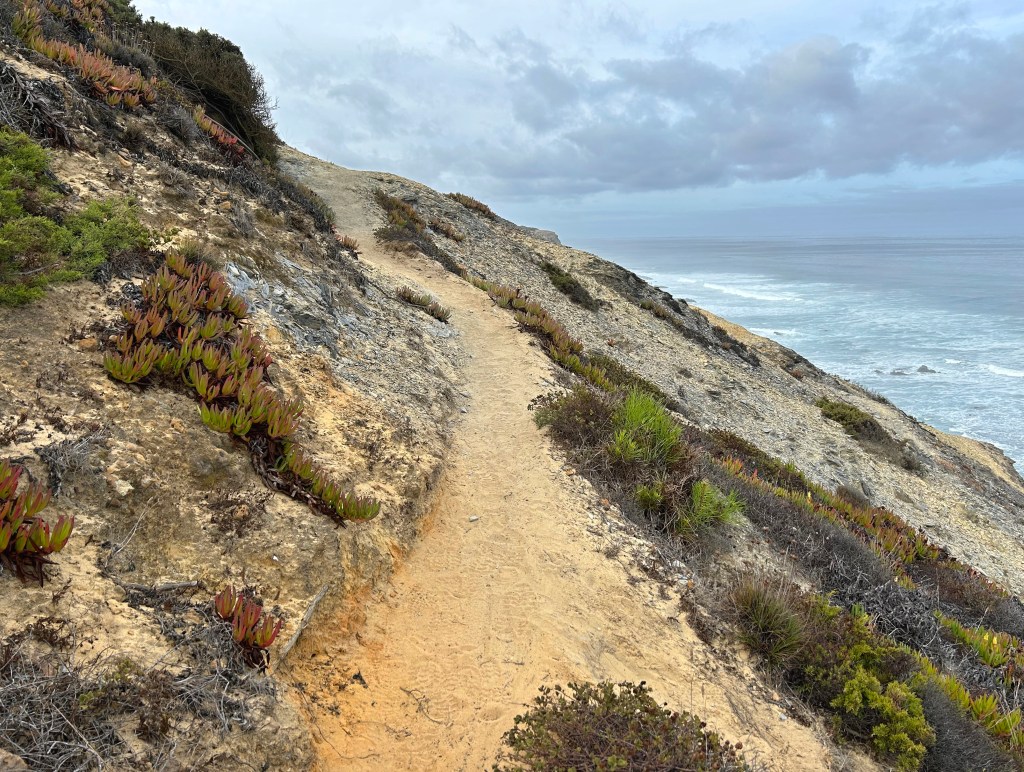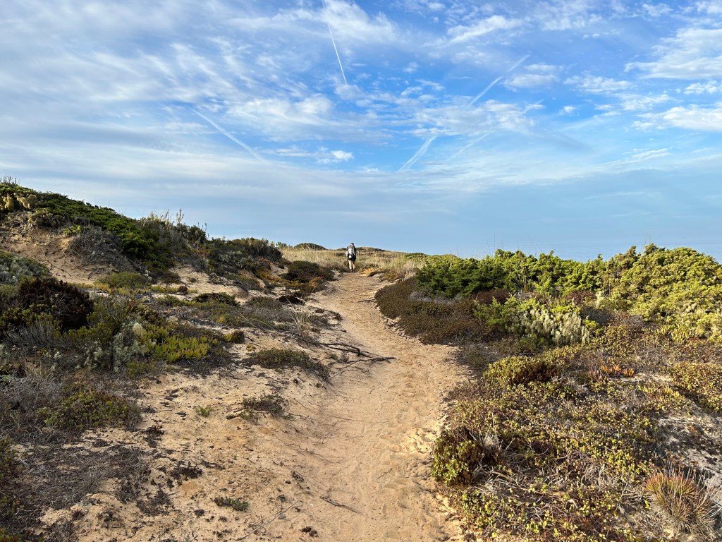6. září 2023: Poslední den na stezce. Vycházíme brzy, už v sedm, abychom stihly autobus z Aljezuru do Lisabonu ve čtyři odpoledne. Po ránu je trochu chladno, jdeme jen v kraťasech a triku s dlouhým rukávem, ale záhy nasazujeme mikiny. První část cesty vede po pobřeží. V myšlenkách se s ním pomalu loučím, protože pak nás čeká jenom vnitrozemí. Jde se dobře. Asi se mi podařilo sladit s Janou tempo a chodím rychleji. Od oceánu vane příjemný osvěžující vítr.