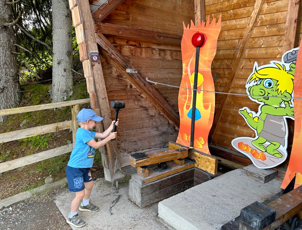 Počasí nám přeje a tak se po vyjížďce přesouváme (opět) autobusem ke stanici lanovky areitXpress. Tou vyjedeme nahoru, abychom si prošli Schmidolínův zážitkový svět. Jedná se o nádherně zpracovanou stezku pro děti plnou interaktivních zastávek a tak jí s manželem vyzkoušíme i my. Pobavíme tím tak všechny zúčastněné 🙂 Já jsem se do toho opřela asi trochu víc, takže si ze dvou stanovišť odnáším i zranění 😄 Toto místo doporučujeme všem, kteří se do této oblasti vydají s dětmi.
